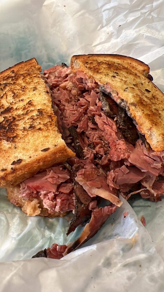 The place does not have aesthetics or great service. But their food was great. The pastrami sandwich is amazing (5/5). The French fries smelled amazing but didn’t have much seasoning though..! They were fluffy not crunchy. The place was packed with people in a small space which scared me a little (2/5). But I guess it was everyday regulars. Overall don’t go expecting anything else apart from good food. They have parking but they don’t take cards.